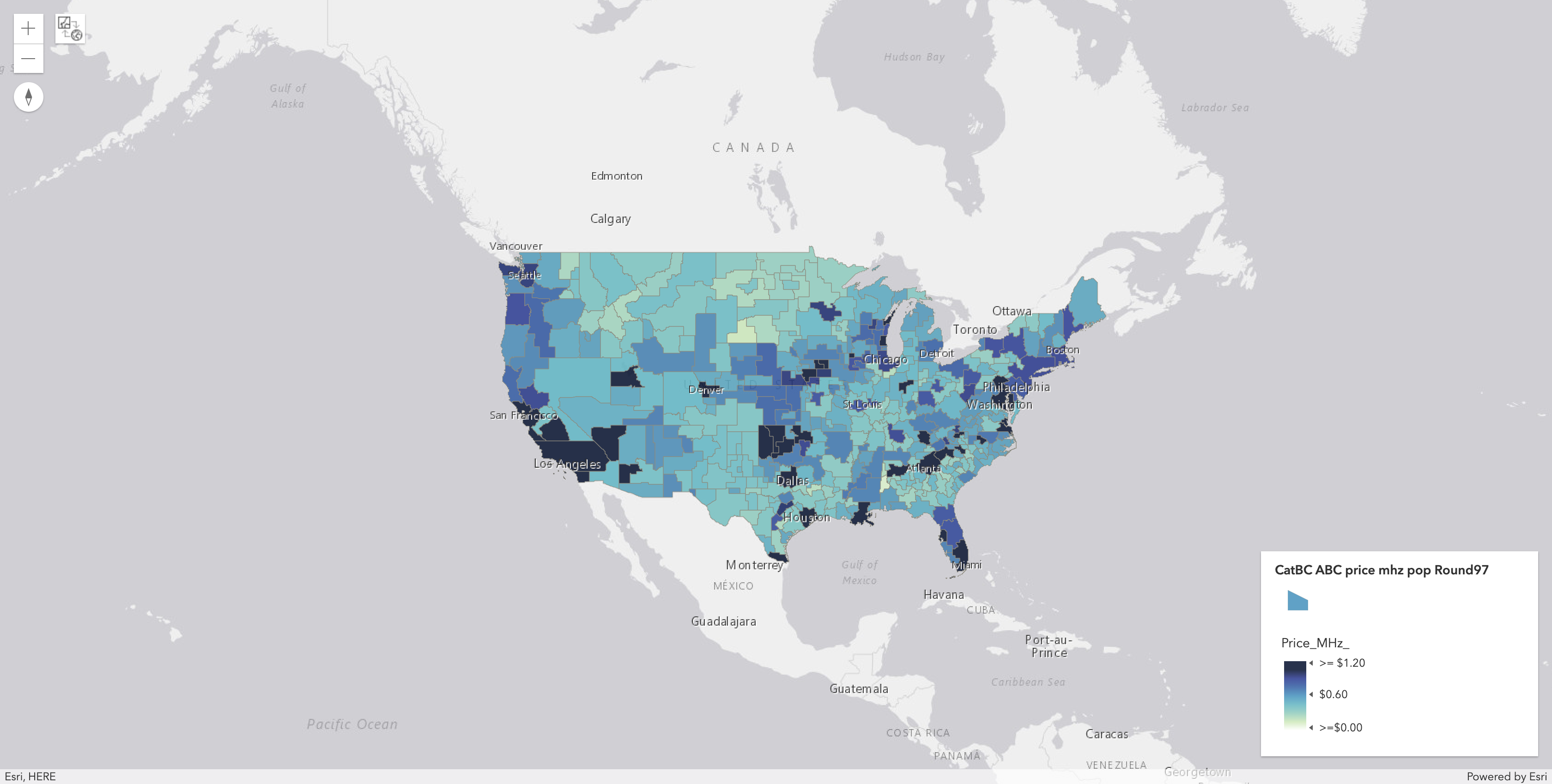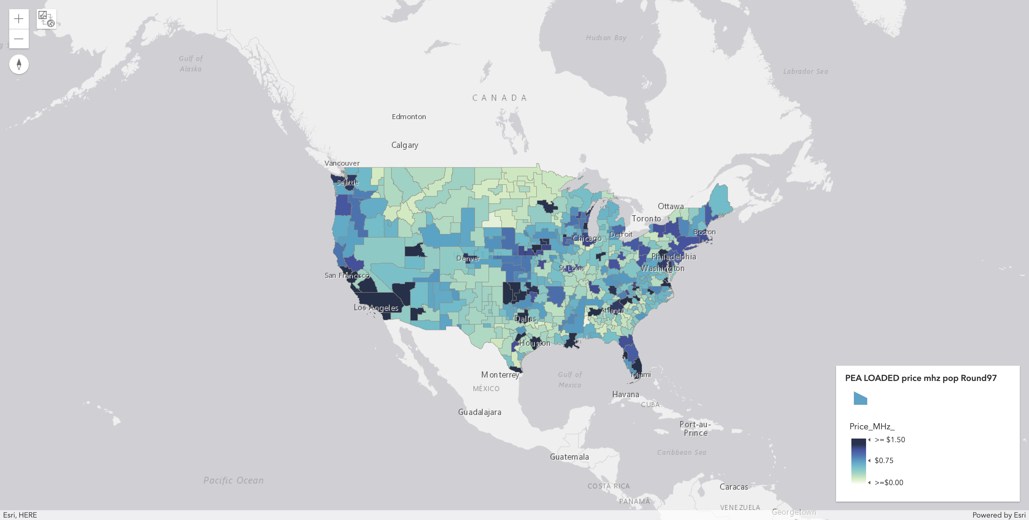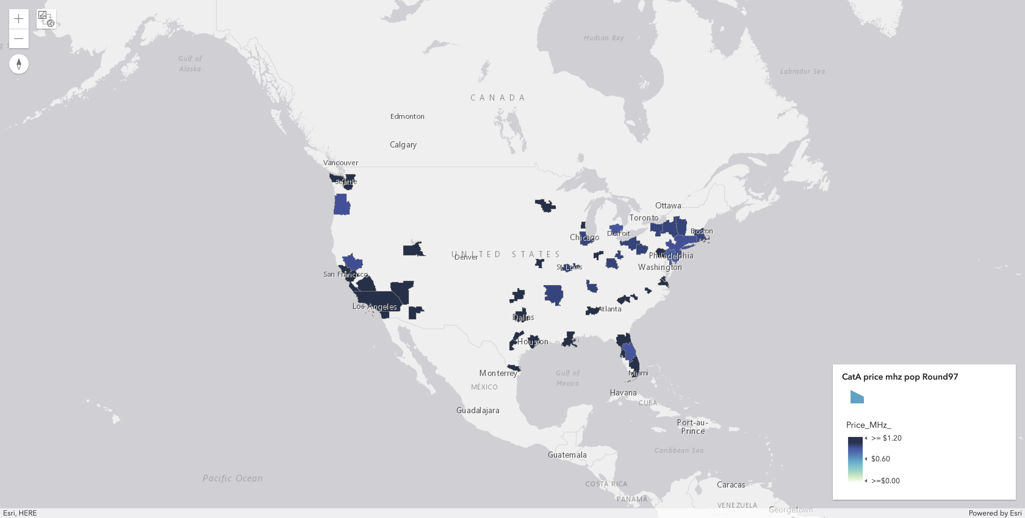Market Number | Market Name | Category | Population | Bidding Units | Supply | Aggregate Demand | Excess Demand | Demand Change | Posted Price | Gross Proceeds | Price Per MHz POP (for product) | Fully Loaded Price Per MHz POP (for product) | Price Per MHz POP (for PEA) | Reference Market Number | Reference Market Name | Predicted Price (for PEA) | Overprice Ratio (Log Base10) |
