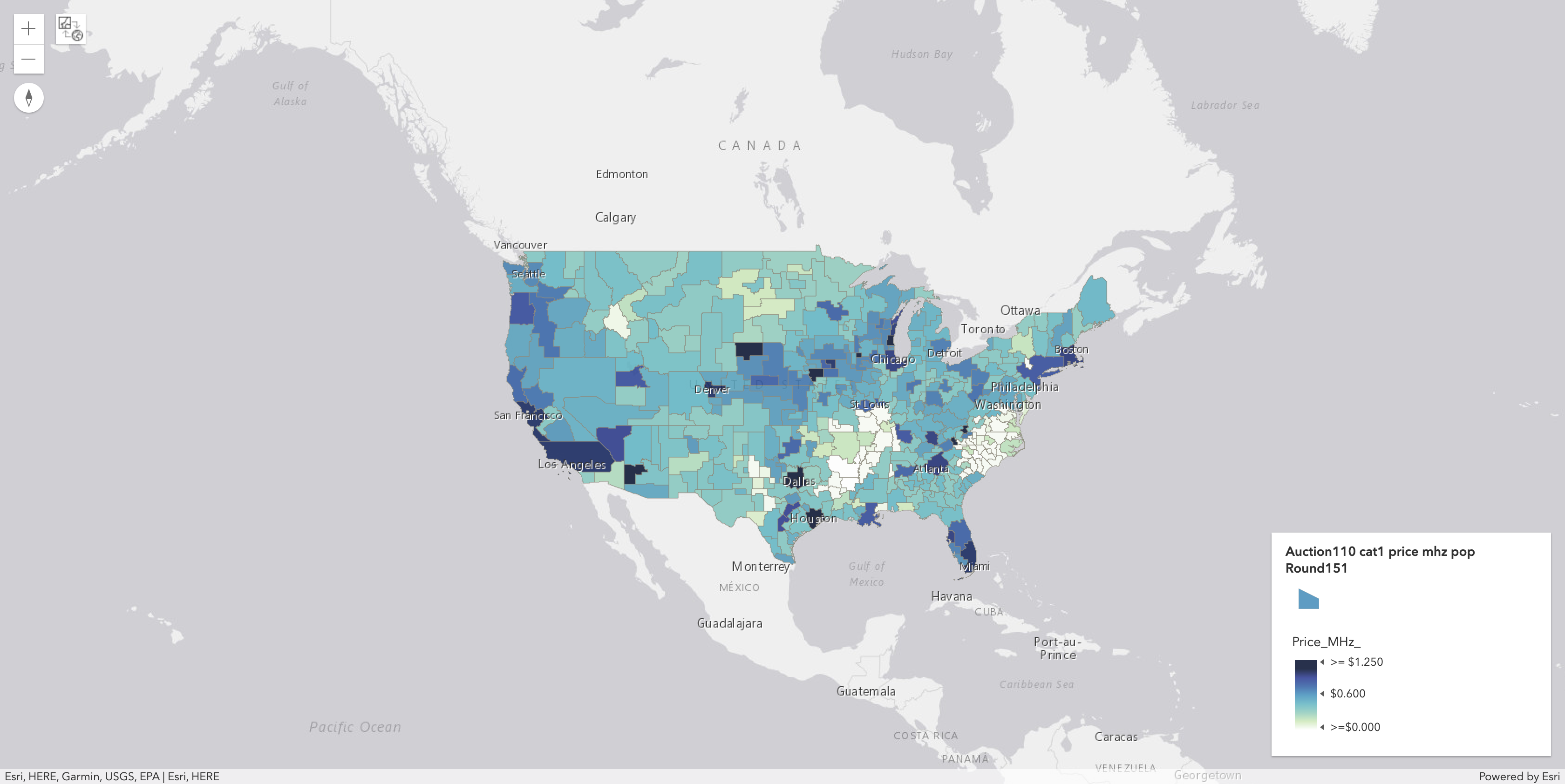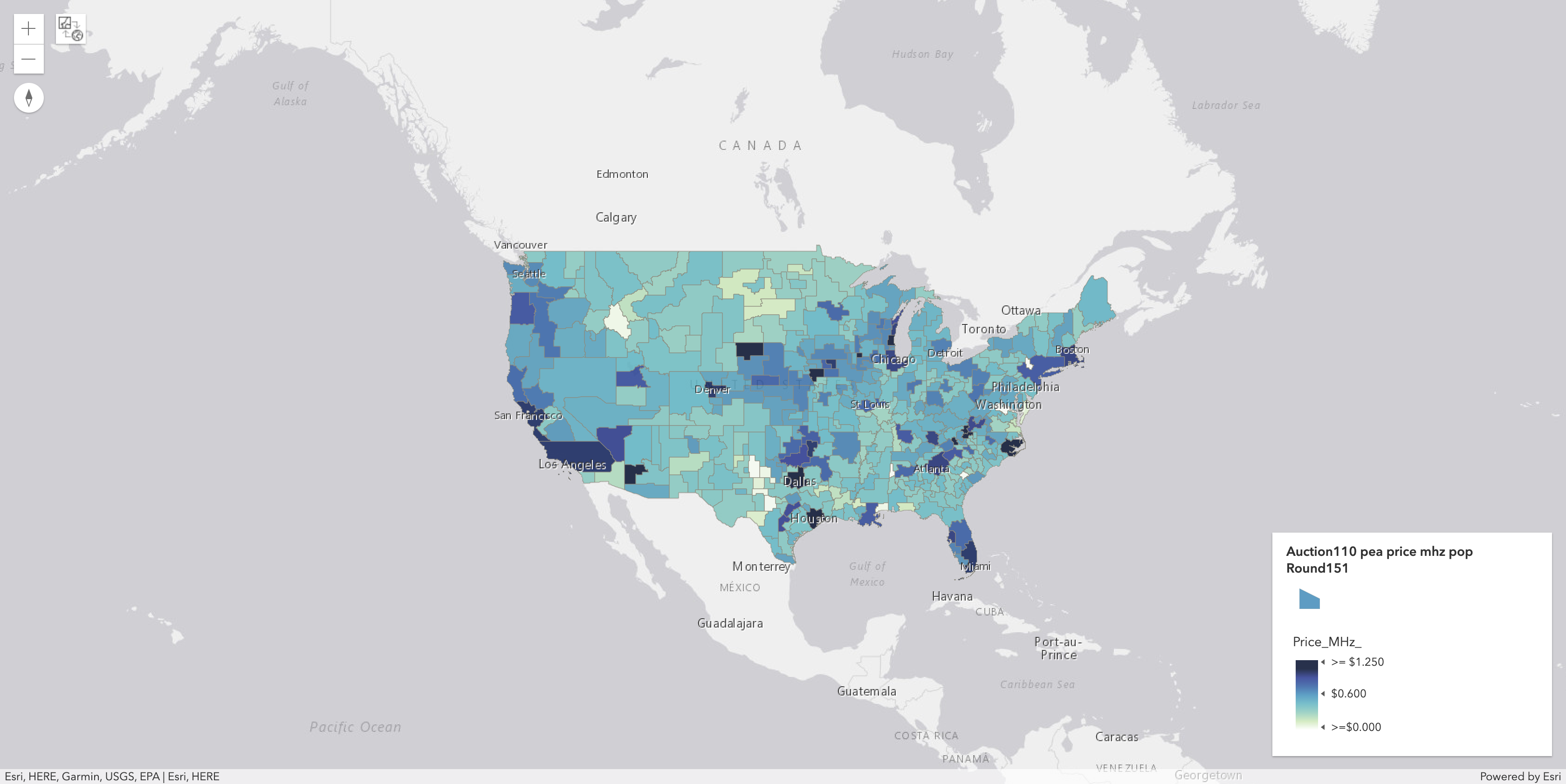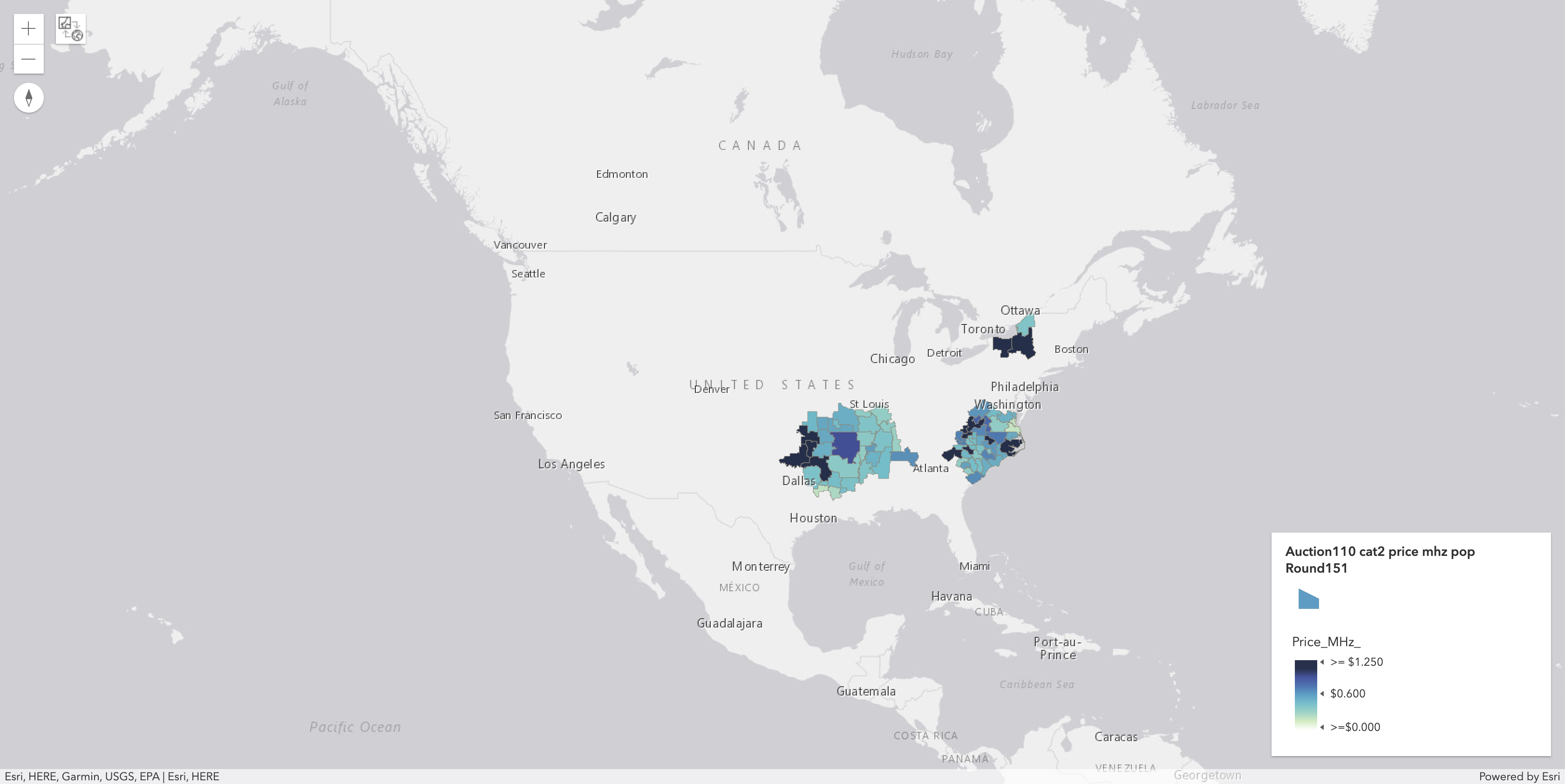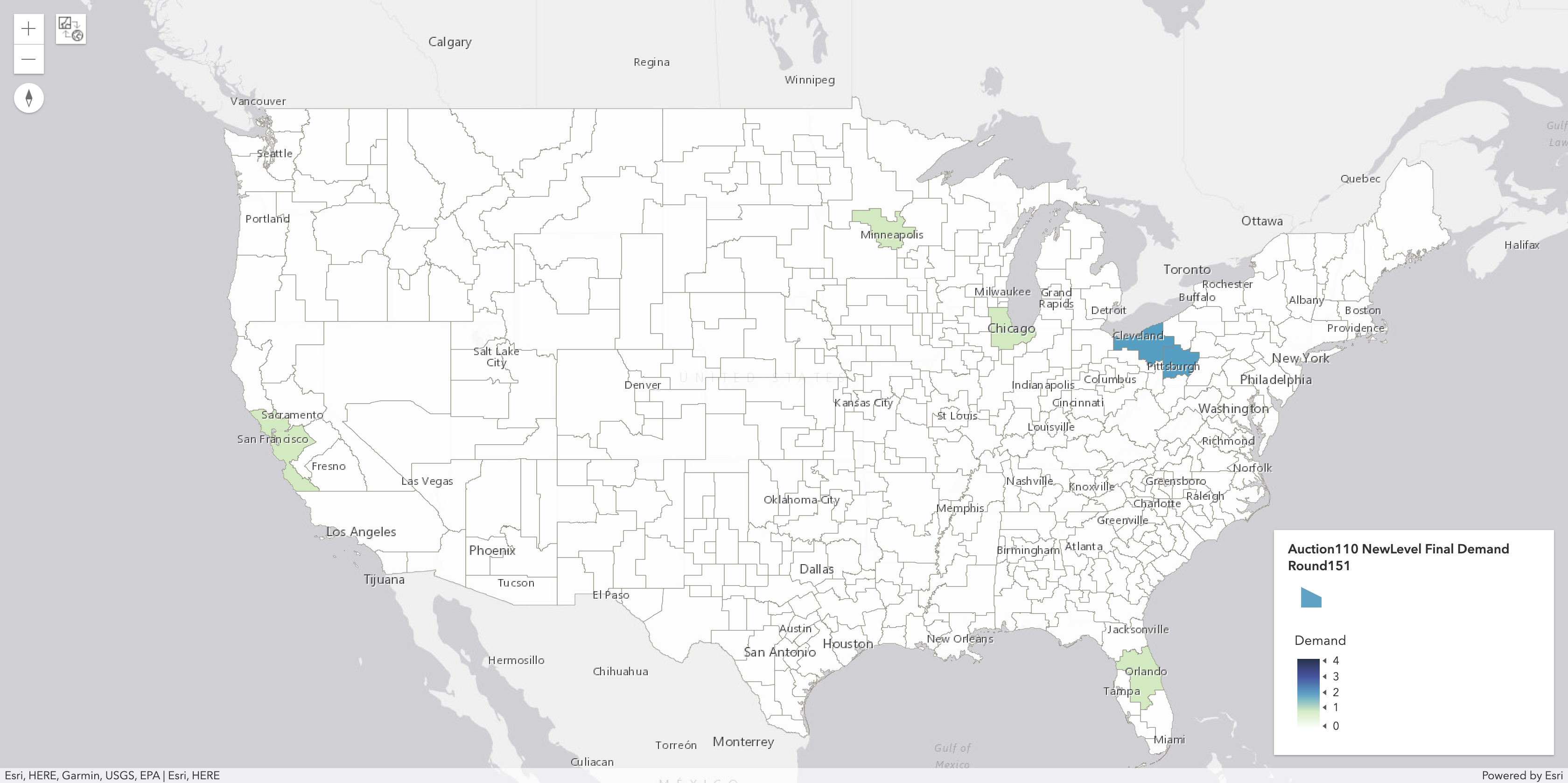 Market Number | Market Name | Category | Population | Population 2020 | Bidding Units | Supply | Aggregate Demand | Excess Demand | Demand Change | Coord % Year 0 | Coord % Year 1 | Coord Class | Posted Price | Gross Proceeds | Price Per MHz POP (for product) | Price Per MHz POP 2020 (for product) | Price Per MHz POP (for PEA) | Reference Market Number | Reference Market Name | Predicted Price (for PEA) | Overprice Ratio (Log Base10) |