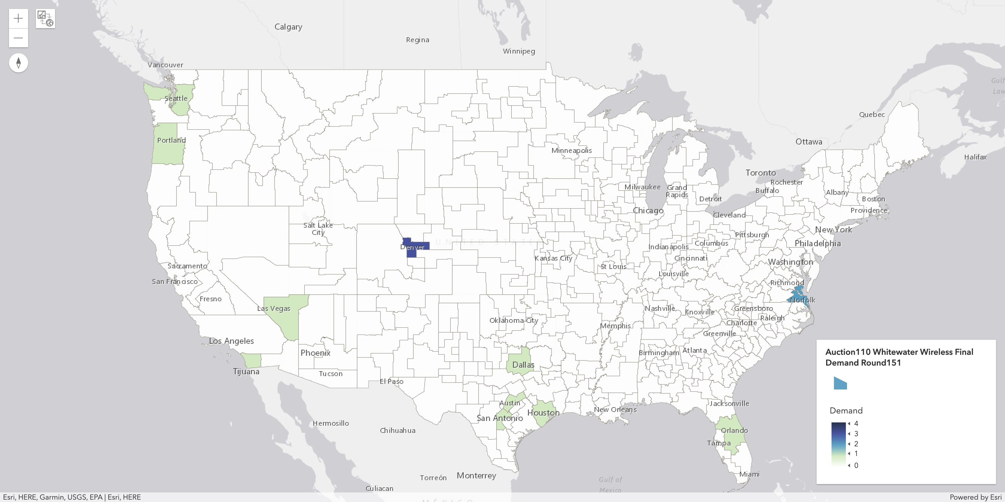 Bidder | # of Markets Covered | # of Licenses Won | Ave. Depth | Weighted Ave. Depth | Pops Covered | % of CONUS Covered | Gross Payments | Net Payments | Gross $/MHz-POP | Net $/MHz-POP |
